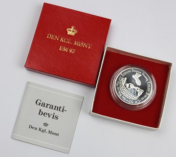 Medaille af finsølv, præget hos Den Kgl. Mønt i anledning af, at Danmark vinder Europamesterskabet i fodbold i 1992. Ø. 38 mm.