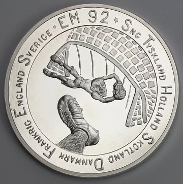 Medaille af finsølv, præget hos Den Kgl. Mønt i anledning af, at Danmark vinder Europamesterskabet i fodbold i 1992. Ø. 38 mm.
