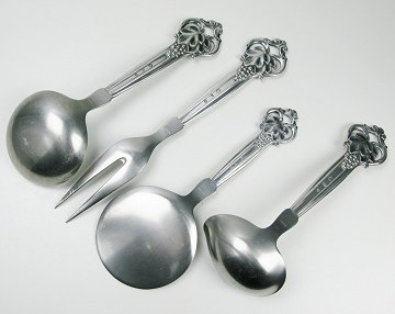 4 dele Cohr serveringsbestik i form af stegegaffel, sauceske, potageske og kagespade. Cohr Middelfart 1948