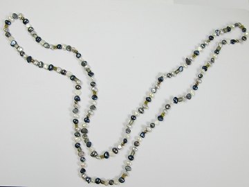 Halskæde monteret med perlemor, påfuglefarvede og kongeblå ferskvandperler, ca. 4 - 7 mm. hvorimellem forgyldte segmenter. L. Ca. 96 cm.