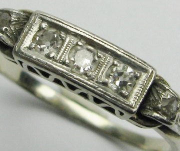 Romatisk ring af 14 kt. guld med forhøjet, gennembrudt skinne, prydet med 3 diamanter (gl. slibn.), flankeret af 2 facetslebne sten. Ring Str. 57, vægt 2,8 gr.