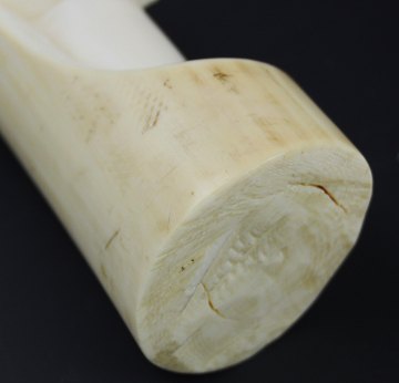 Stødtand fra afrikansk elefant (Loxodonta africana) med kunstnerisk skæring i form af maskaron med flipskæg. L. 26,5 cm., vægt 0,343 kg.