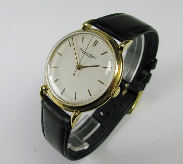 IWC vintage herrearmbåndsur fra 1948 i urkasse af 18 kt. guld. Lys skive med stregindikationer og central sekundviser. Optræksværk. Læderlænke med metalspænde. Urkasse Diam. 36 mm.