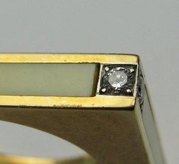 Ring af 14 kt. guld med ligesidet skinne med sandwich bendekoration, prydet med 4 brillantslebne diamanter på tilsammen ca. 0,16 ct. Ring Str. 51½, ydermål 22,5 x 20,5 mm., vægt ca. 7 gr.