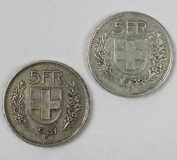 Schweiz, 5 franc 1931 og 1932 SØLV - KM 40 (2)