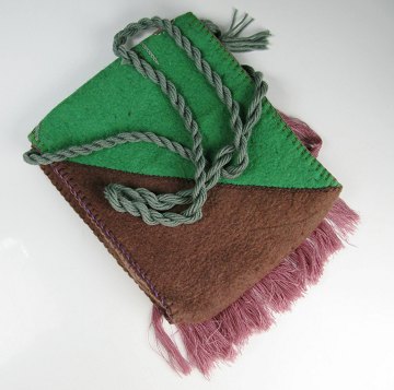 Nomadetaske af filt og bomuldslærred, dekoreret med mønstersyninger og stiklinger samt frynser af farvet garn. Skulderrem ligeledes af snoet garn. 25 x 33 cm., 20 årh.