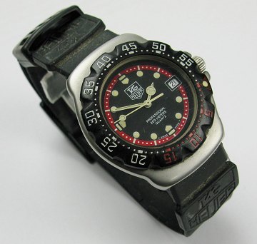 Tag Heuer herrearmbåndsur i urkasse af stål med sort skive, rød sekundindikation og central sekundviser. Sort lynette med hvide og røde tal. Quartsværk. Gummilænke med metalspænde. Urkasse Diam. 35 mm.