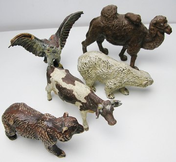 Samling Lneol, elastolin m.v. legetøjsdyr i form af kamel, ørn, brunbjørn, isbjørn, isbjørnunge, krokodille, sæl og 2 aber og mælkeko. Alle med små afslag.