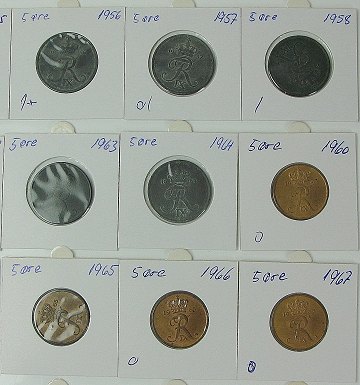 Komplet samling 5 ører 1953-1988, dog uden 5 øre 1959.