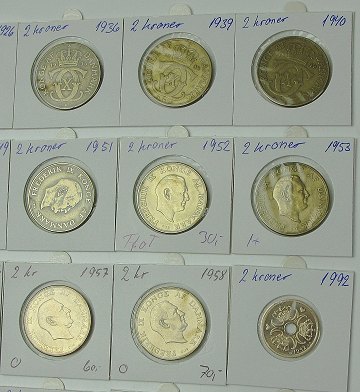 Lot 2 kroner, bestående af: 1875, 1925,-26,-36,-39,-40,-47,-48,-49,-51,-52,-53,-54,-55,-56,-57,-,-58, 1992,-93,-94,-95,-96,-97,-98,-99, 2000,-01,-02,-03,-04,-05,-06,-07.