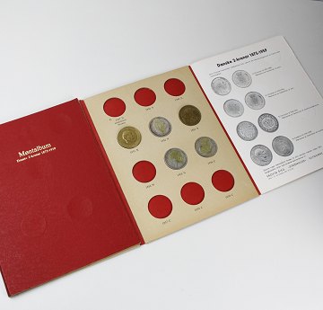Møntalbum, Danske 2 kr 1875-1959 indeholdende 2 kr. 1875, 2 kr. 1876 og 2 kr. 1916, alle sølv, samt 2 kr 1925 og 2 kr 1945. 5 mønter i alt. Finsølvindhold 36 gr.