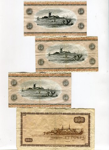 Danmark, 100 kr B2 1965 samt 3x 10 kr *Portræt og landskab*