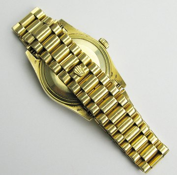 Rolex Oyster Perpetual Day-Date herrearmbåndsur i urkasse og med lænke af 18 kt. guld. Champagnefarvet skive bag safïrglas med stregindikation, central sekundviser, ugedag visning i #12 positionen og datovisning i #3 positionen. Automatisk værk. Urkasse Diam. 36 mm. Ref. nr. 18078.