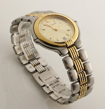 Guy Laroche armbåndsur i urkasse og med lænke af delvist forgyldt stål. Struktureret skive med stregindikationer, central sekundviser og datovisning i #6 positionen. Quartsværk. Urkasse Diam. 35 mm.