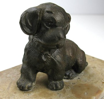 Bronzefigur i form af hundehvalp, monteret på marmorsokkel. H. 7,5 cm., usigneret.