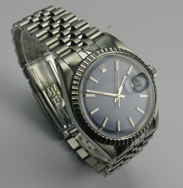 Rolex herrearmbåndsur, model Datejust i urkasse og med lænke af stål. Blå skive med stregindeks, central sekundviser og datoangivelse ved #3 positionen, automatisk værk. Diam. 35,5 mm.