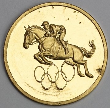 Medalje af GULD præget i anledningen af OL i München 1972. Bymotiv og rytter til hest.