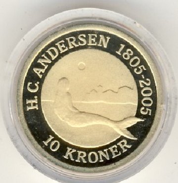 Denne 10 kr, præget på Den Kongelige Mønt, er udgivet i anledning af 200 året for H.C. Andersens fødsel d. 2. april 1805.