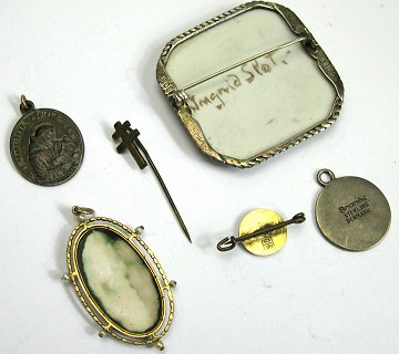 Lot bestående af sølvindfattet, håndbemalet porcelænsbroche, signeret Ingrid Slot, forgyldt indfattet vedhæng med porcelænsmedaillon, Frans af Assis vedhæng af metal, THL vedhæng af sterling sølv Sygeplejerske emblem af sterling sølv og pin i form af patriarkkors.