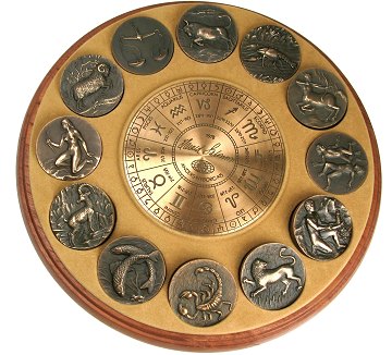 Komplet stjernetegnserie i form af tunge bronzemedailler, alle prydet med "ædelsten" i form af smykkesten. I alt 12 medailler i tilhørende showcase af træ. Hver medaille Diam. 50 mm. Limiteret udgave. Diam. 70 mm.