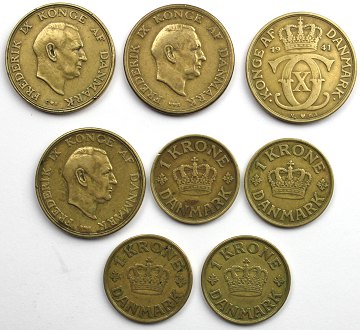 Lot bedre gule 1 og 2 kr, bestående af: 1 kr 1929,-31,-36,-41 samt 2 kr 1941,-49,-55,-59. Ialt 8 stk.