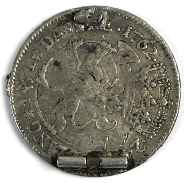 Frederik V 24 skilling 1762 med loddespor og hængsel fra brochemontering.