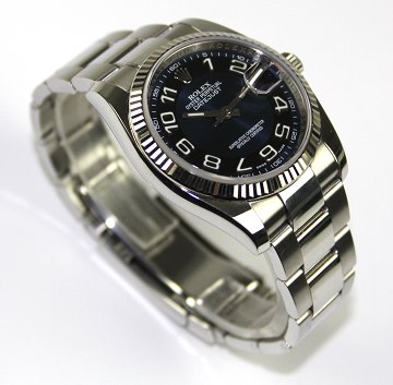 Rolex Oyster Datejust armbåndsur, referencenr. 116234 i urkasse og med lænke af stål. Mørk stålblå skive bag safirglas med kontrastring, hvorpå arabertal og stregindikationer. Central sekundviser og datovisning i #3 positionen. Automatisk værk. Urkasse Diam. 36 mm.