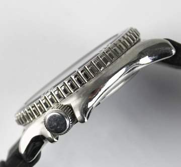 Seiko Quartz dykkerur med sort skive, selvlysende punktindikationer, central sekundviser og dag/datovisning i #3 positionen. Quartsværk. Urkasse 42 mm. Gummilænke med metalspænde.