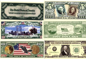 12 amerikanske propagandasedler i form af modificerede dollarsedler med forskellige motiver.