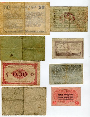 7 franske nødpengesedler fra tiden omkring 1. verdenskrig, heriblandt en italiensk nødpengeseddel på 50 centesimi 1918. 8 sedler i alt.