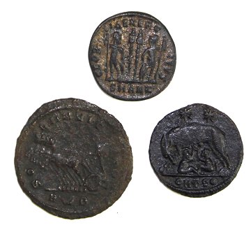 3 antikke romerske mønter med bl.a. Romulus og Remus med ulven og stridsvogn.
