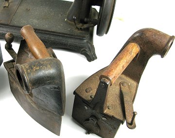 Lot bestående af gl. håndsving symaskine og 3 gl. kul strygejern af støbemetal samt tidligt el. strygejern fra 1940'erne.