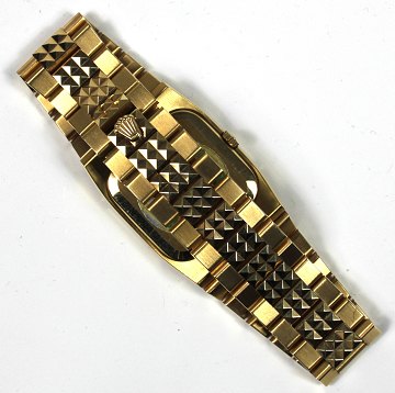 Rolex Genève damearmbåndsur i urkasse og med lænke af 18 kt. guld. Profileret skive med oktogon krans, prydet med 32 brillantslebne diamanter. Manuel mekanisk optræksværk. Ref. nr. 5153.