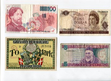 Lot bestående af 2 tyske inflationssedler 50 millioner og 10 milliarder mark, Gramby Kommune 2 mark 1920, Belgien 100 francs, Littauen 5 litai, Nederlandene 2½ gylden, USA 1 dollar Washington, New Zealand dollar, Sydafrika 10 rand og Tanzania10 shillingi.