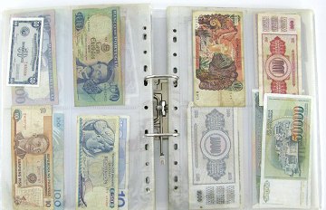 Ringbind med 48 indstikssider, indeholdende pengesedler fra hele verden, lige fra den tyske inflationstid op til ca. 1970, heriblandt en del interessante sedler i forskellige kvaliteter.