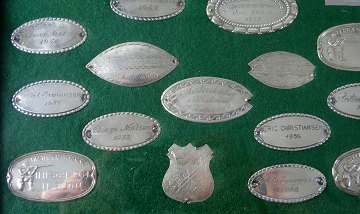 Samling flagtegn og præmietegn af sølv og delvis af sølvplet. Alle monteret i træramme bag glas.