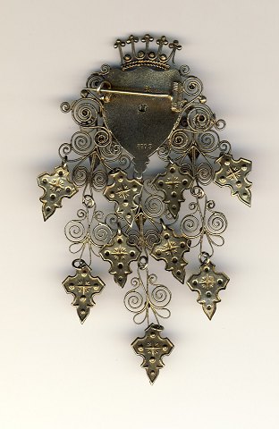 Norsk sølvsmykke af forgyldt sølv, prydet med emaljearbejde i form af skjold med norsk løve. Skjoldet med krone øverst - fint håndarbejde. h.10 x b.5 cm