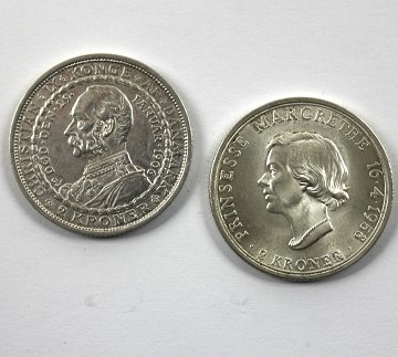 Henholdsvis 2 kr 1906 tronskiftet Chr. IX til Fr. VIII samt 2 kr samt 2 kr. 1958 *Prinsesse Margrethes 18 års fødselsdag*. Henholdsvis 4 H 3 og 11 H 3. Samlet finsølvindhold 24 gr.