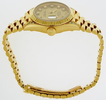 Damearmbåndsur fra Rolex, model Datejust, ref.nr.: 69238, N-serie, i kasse og m. presidentlkænke af 18 kt. guld, brillantbesat champagnefarvet skive, datoangivelse ved 3" position, horn prydet m. brillanter, safirglas, automatisk urværk. Ø. 26 mm.