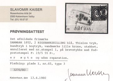 2 RBS brevstykke annuleret m. nummerstempel 1 og fodpoststempel. Farvefriskt mærke med brede rande. AFA kr. 17.000,- for mærke. Attest Kaiser 1980.