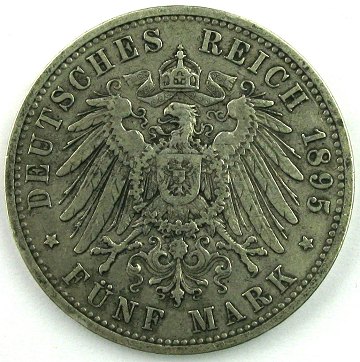 Tyskland, Preussen, Wilhelm II, 5 mark SØLV 1895A - KM 523