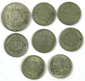 Lot bestående af Gustav V 2 kr 1940 - Sieg 62 samt 7x 1 kr 1940, -42, -43, -45, -46, -49, -50