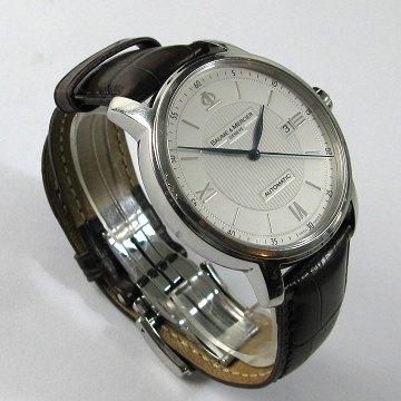 Baume & Mercier Classima Executives Contemporary herrearmbåndsur i urkasse af stål. Hvid, lys skive bag safirglas med romertal og stregindikationer, central sekundviser og datovisning ved #3 positionen. Automatisk værk med værkindsigt på urets bagside. Urkasse Diam 42 mm. Ref. nr. MOA 08791, serie nr. 50XXXXX. Croco læderrem med foldespænde af poleret stål. Nypris kr. 18.700.-
