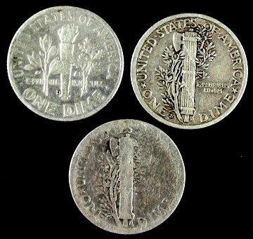 Barber Dime 1937, Mercury Dime 1916 og Roosevelt Dime 1948, henholdsvis KM 113, 140 og 195