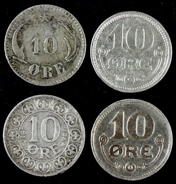 Chr. IX 10 øre 1875, Fr. VIII 10 øre 1912 og Chr. X 10 øre 1915 og 1919