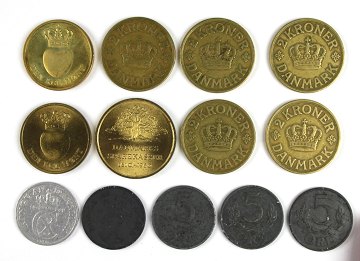 Lot bestående af 5x Chr. X 2 kroner 1925, -26, -36, -39, -40, 5x 5 øre 1941, -43, -44, -45, og -49 samt H.C. Andersen medaille fra den Kgl. mønt, Frederik Adolf Holstein medaille Danske Sparekasser 1810-1960 og Kgl. mønt medaille *Slaget på Reden* 2. april 1801