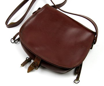 Jagttaske af vandtæt lærred med remme af læder med metalspænder. Ca. mål 25 x 23 cm.