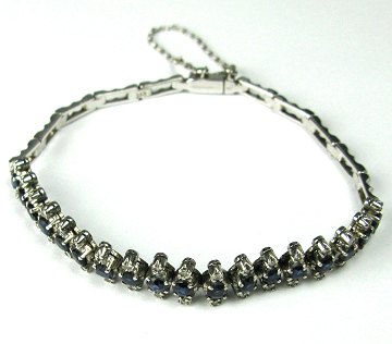 Armlænke af 18 kt. rhodineret hvidguld, prydet med 18 facetslebne, blå safirer, flankeret af 36 små brillantslebne diamanter, samlet ca. 0,18 ct. Sikkerhedslukke med sirlig kæde. L. ca. 18 cm. Samlet vægt 10,4 gr.