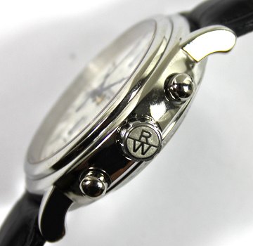 Raymond Weil Maestro chronograph herrearmbåndsur i urkasse af poleret stål. Sølvfarvet struktureret skive bag safirglas med romertal, ekstern sekundviser og datovisning i #3 positionen. Automatisk urværk. Urkasse Diam. 39,5 mm. Læderrem med metalspænde. Ref. nr. 7737-ST-00659