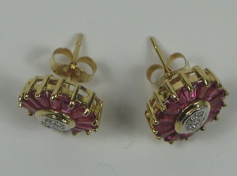 Par roset ørestikker af 14 kt, hver prydet med 4 diamanter, samlet ca. 0,04 ct. samt krans med baquetteslebne, rubinrøde sten. Front ca. 10 x 12 mm., vægt ca. 3,1 gr.